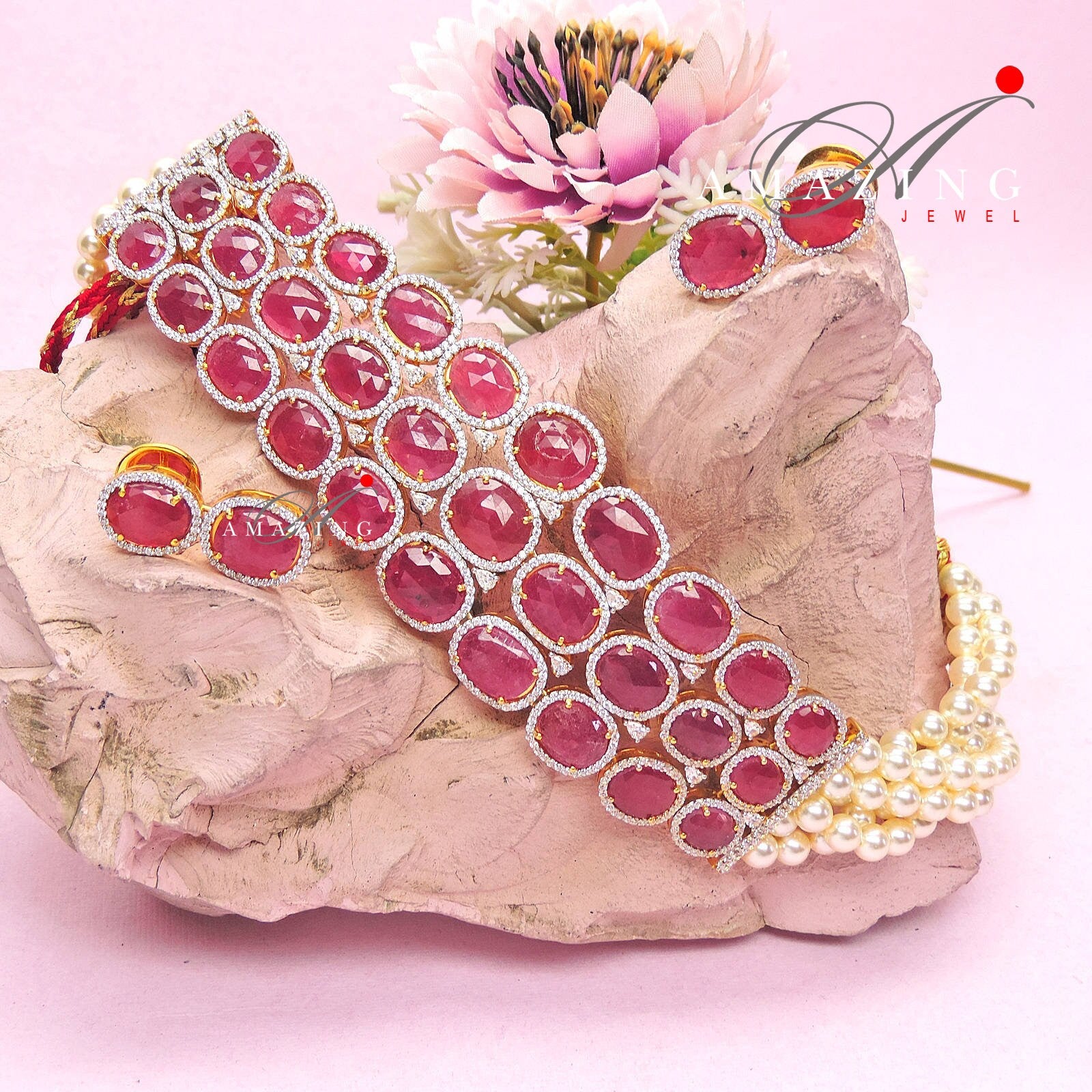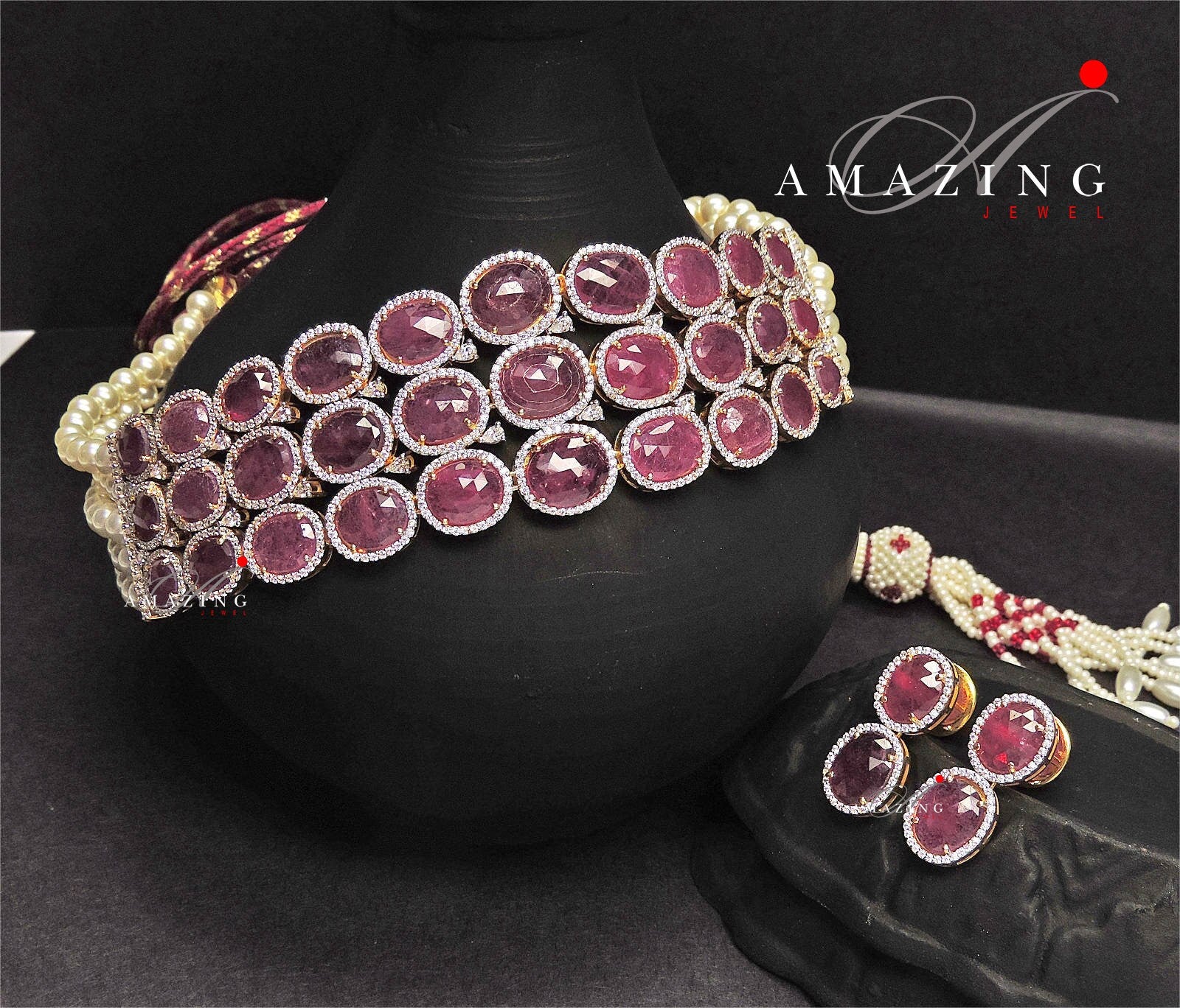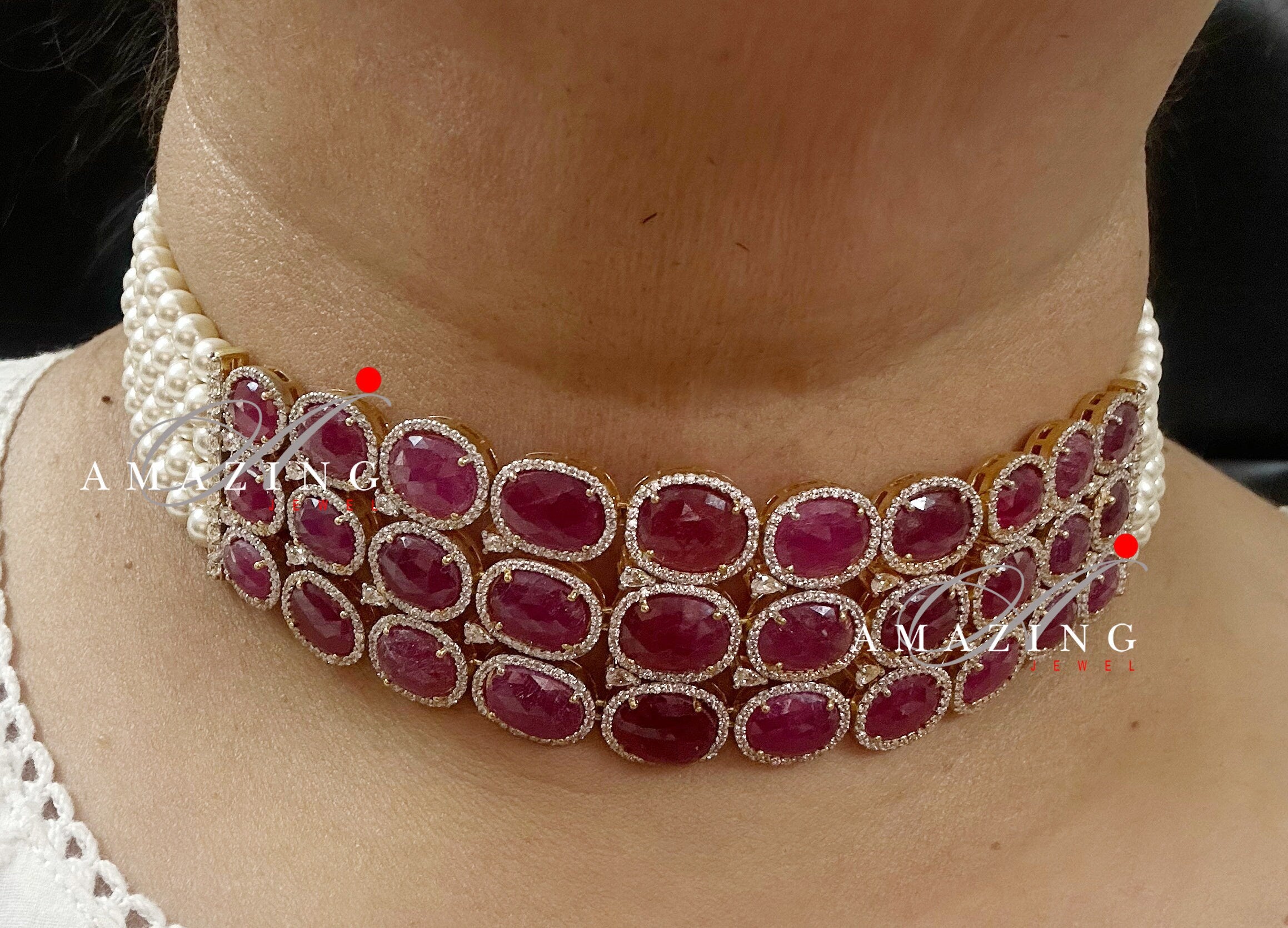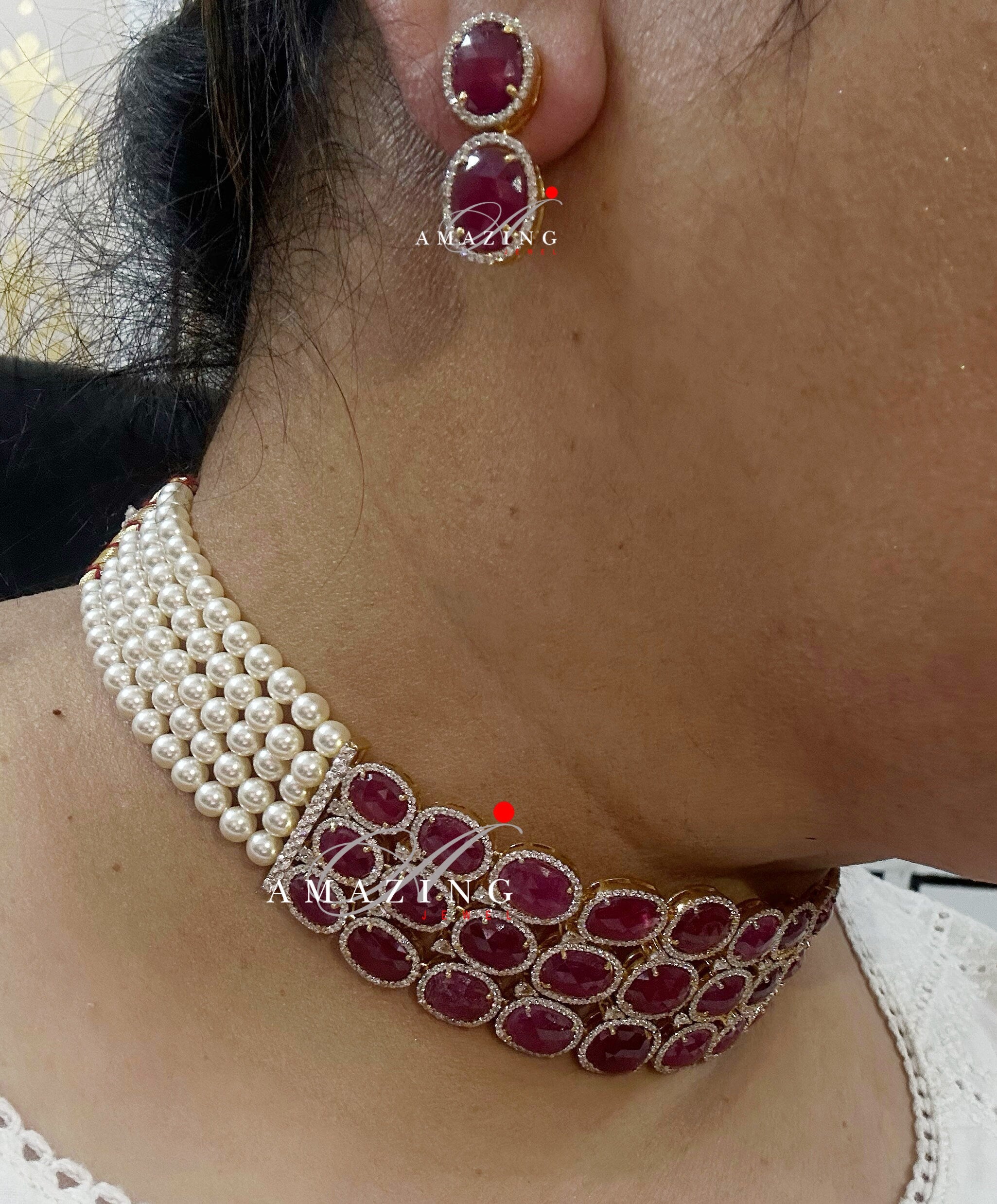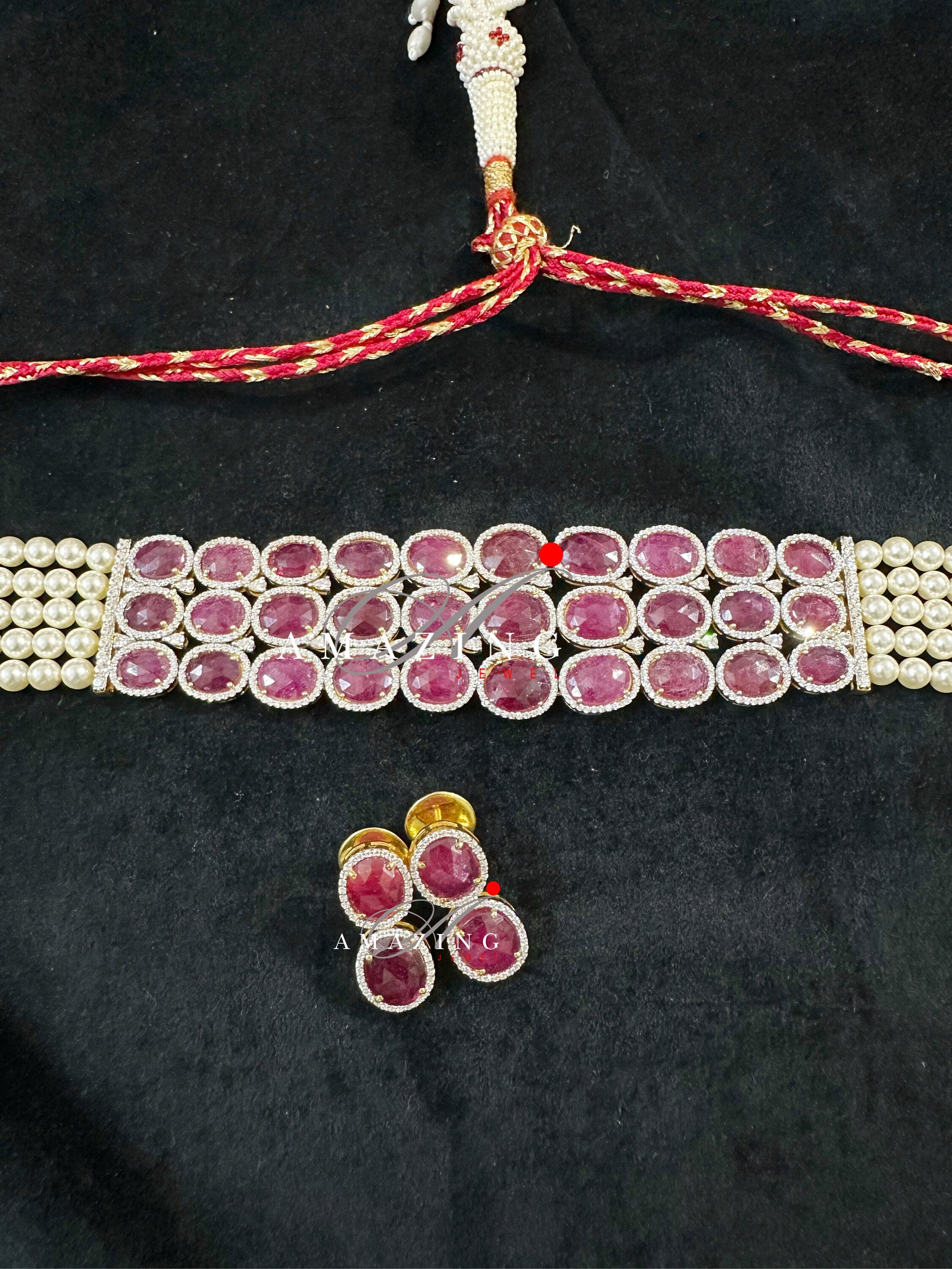 Silver Swarovski Red Choker Necklace, Wedding Jewellery, Bridal Jewellery, 925 Silver Necklace Set, Choker Set, Earrings, Ruby stone Set