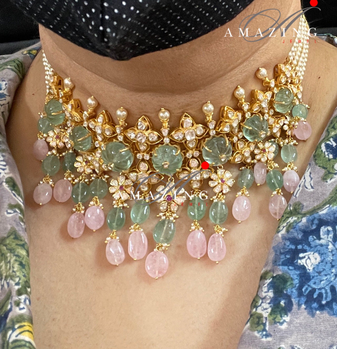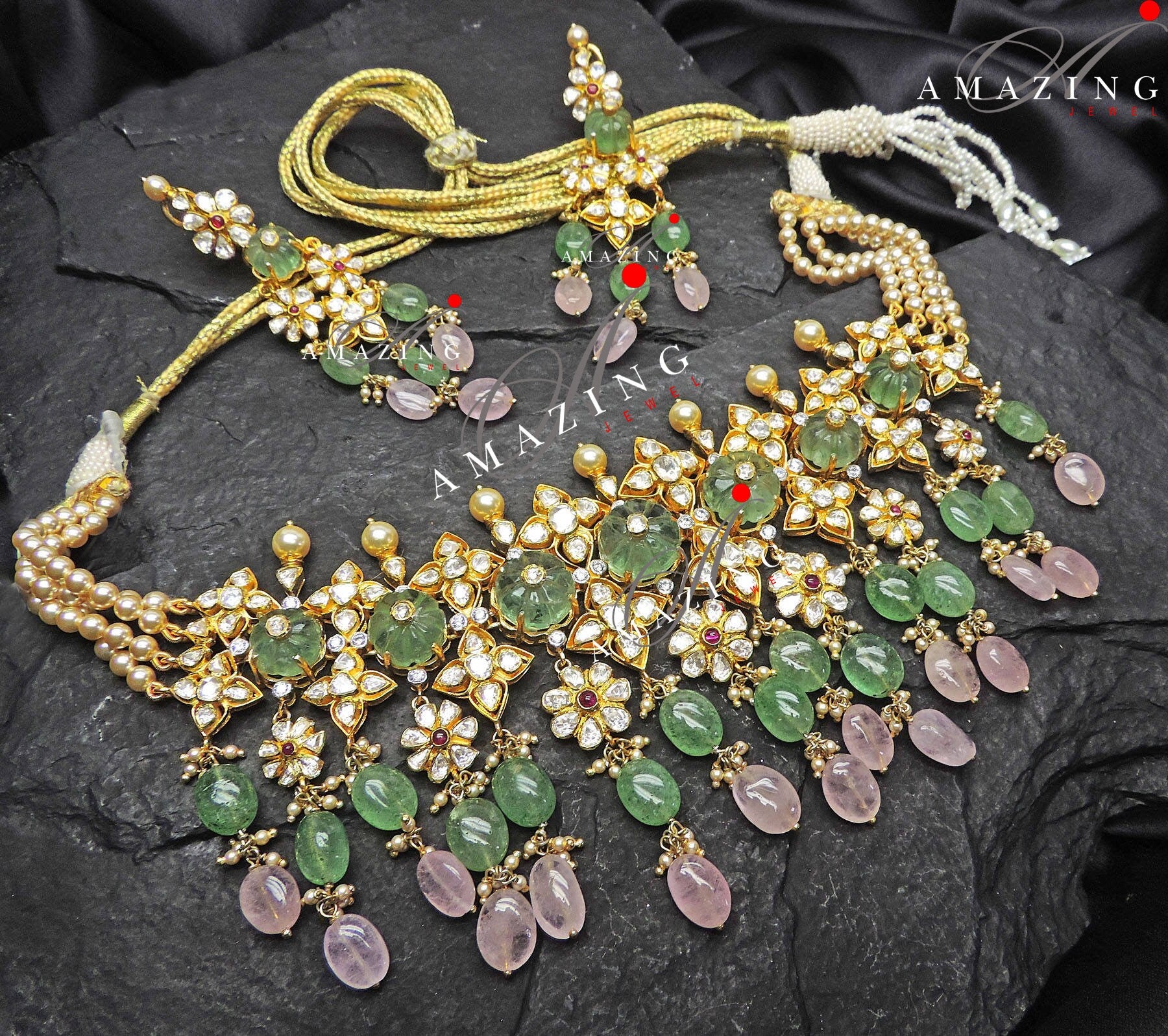 Silver Moissanite Polki Choker with Russian Emerald & Morganite Hydro Beads,Polki Jewelery Set,Indian Traditional Wedding Jewelery,Polki set