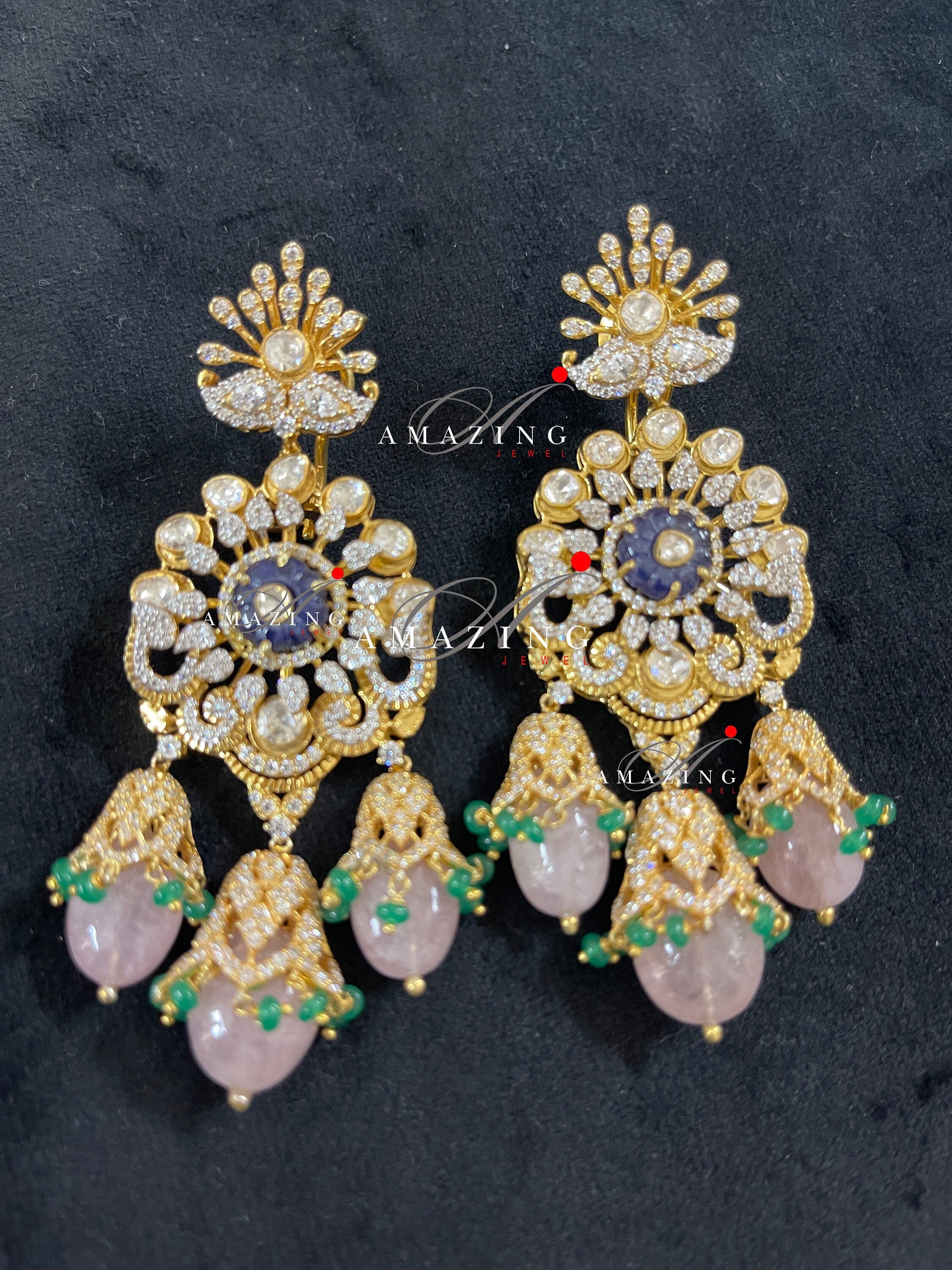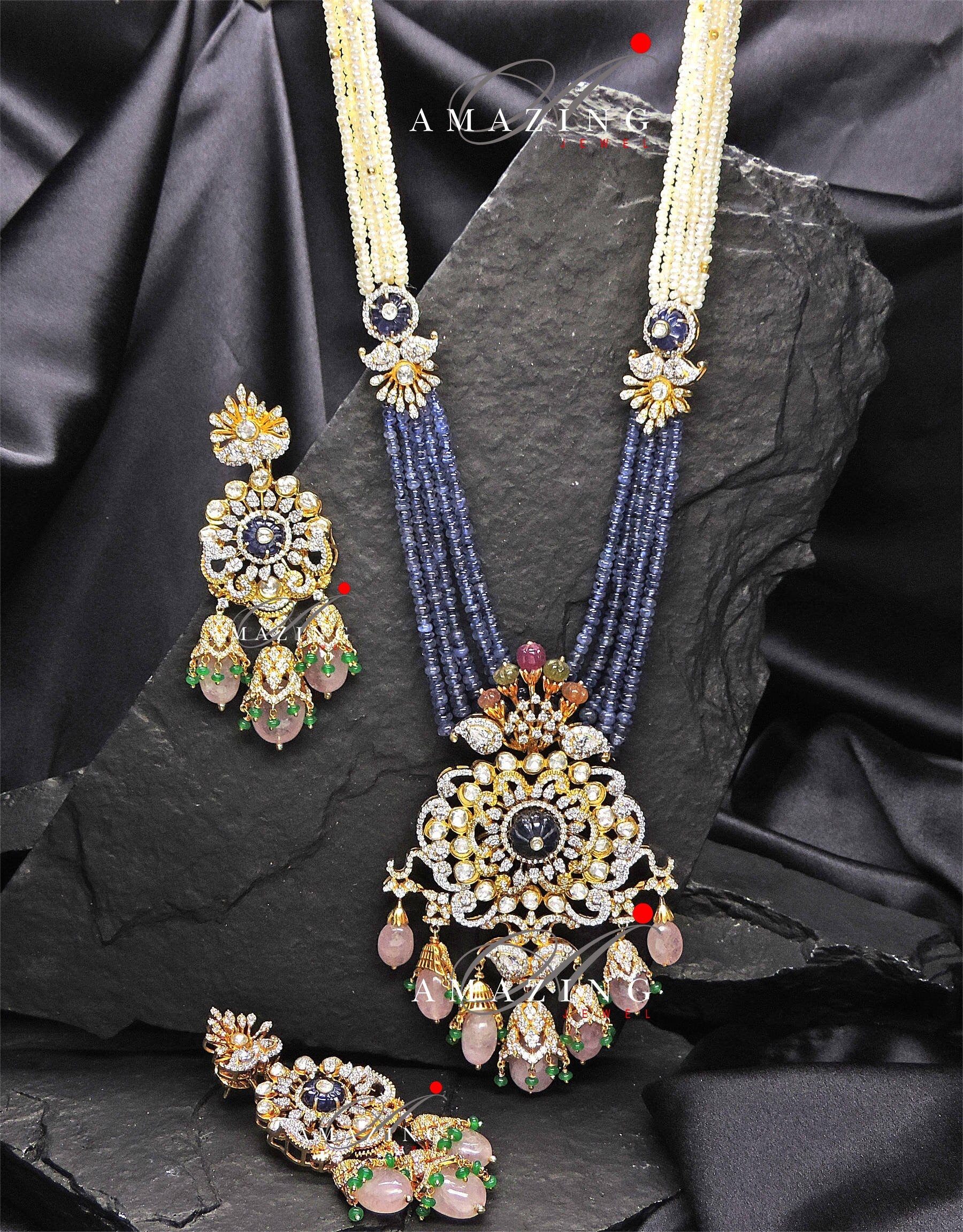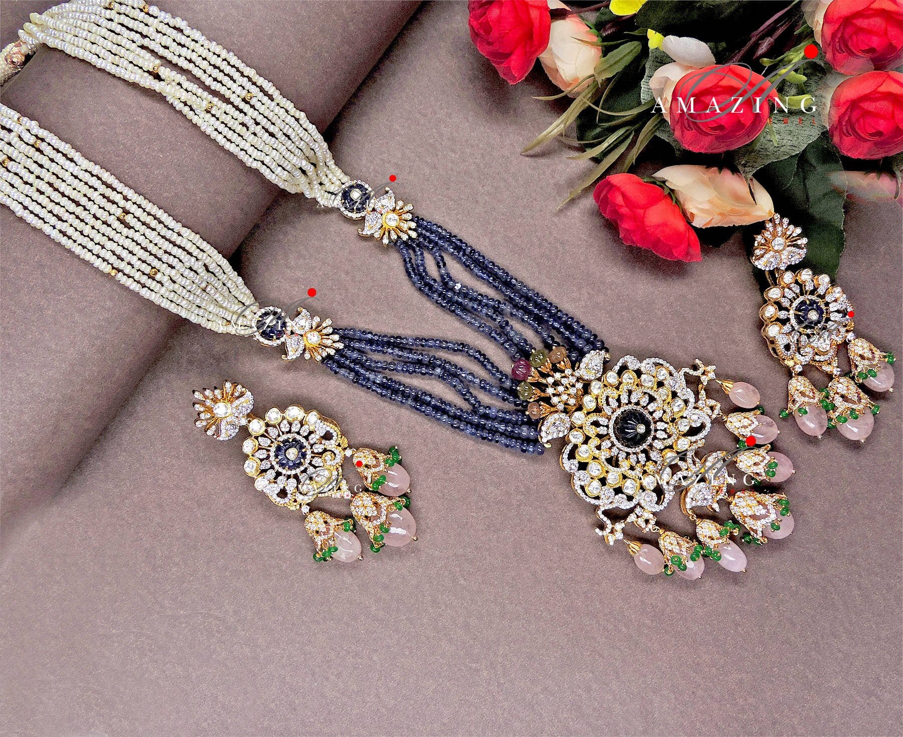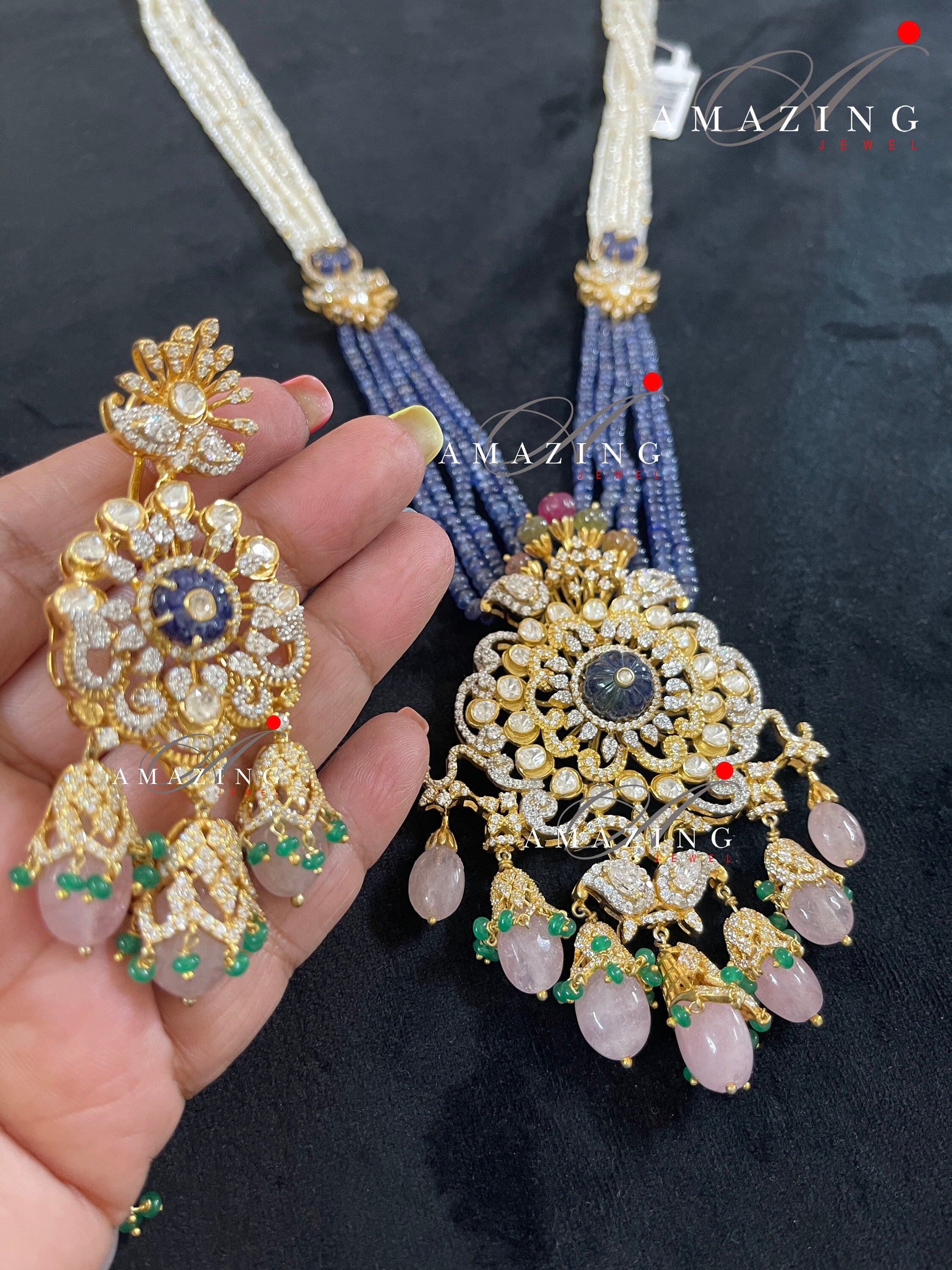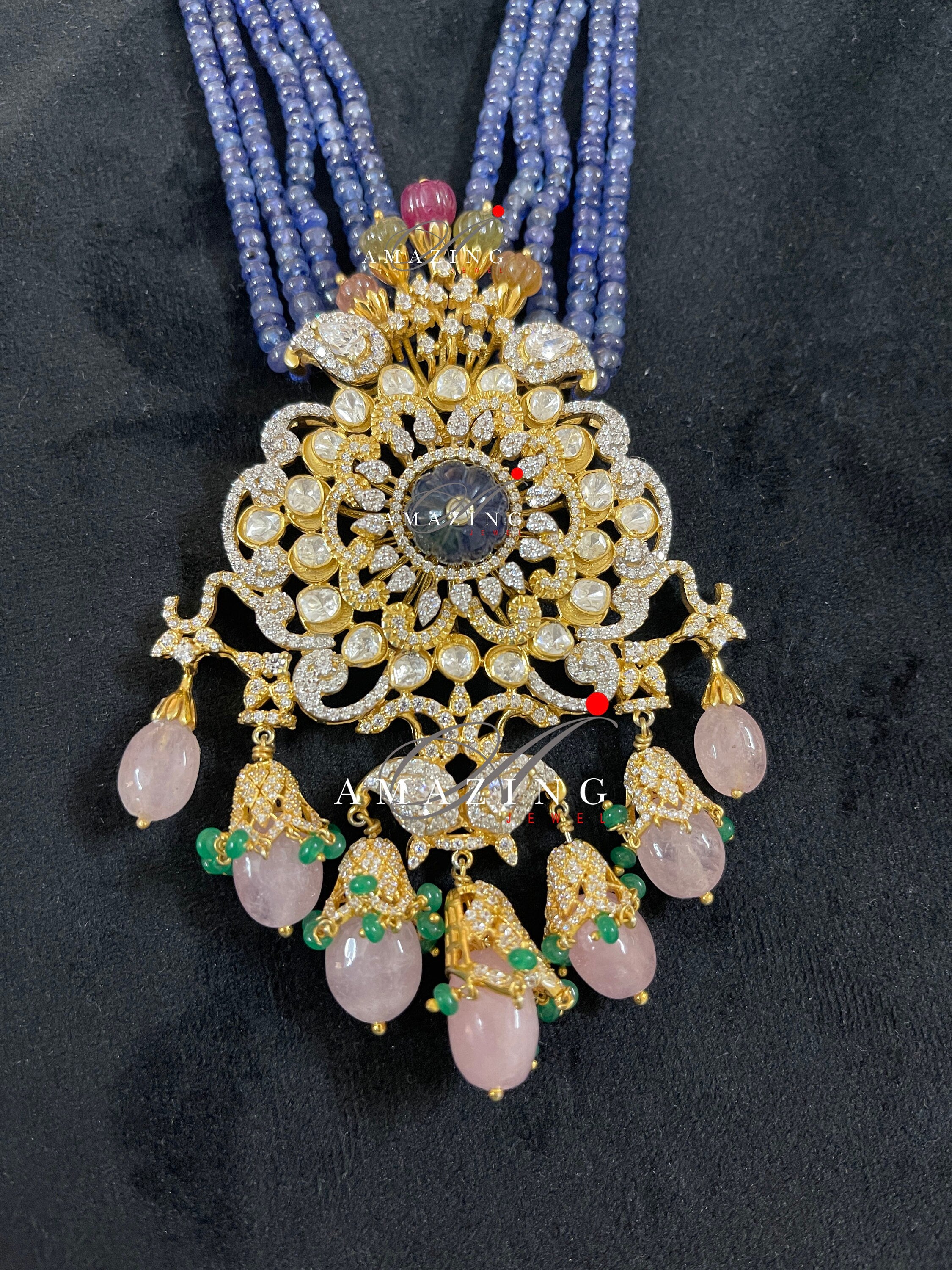 Silver Moissanite Polki Necklace with Sapphire & Morganite Hydro Beads, Polki Jewelery, Indian Traditional Wedding Jewelery, Polki set