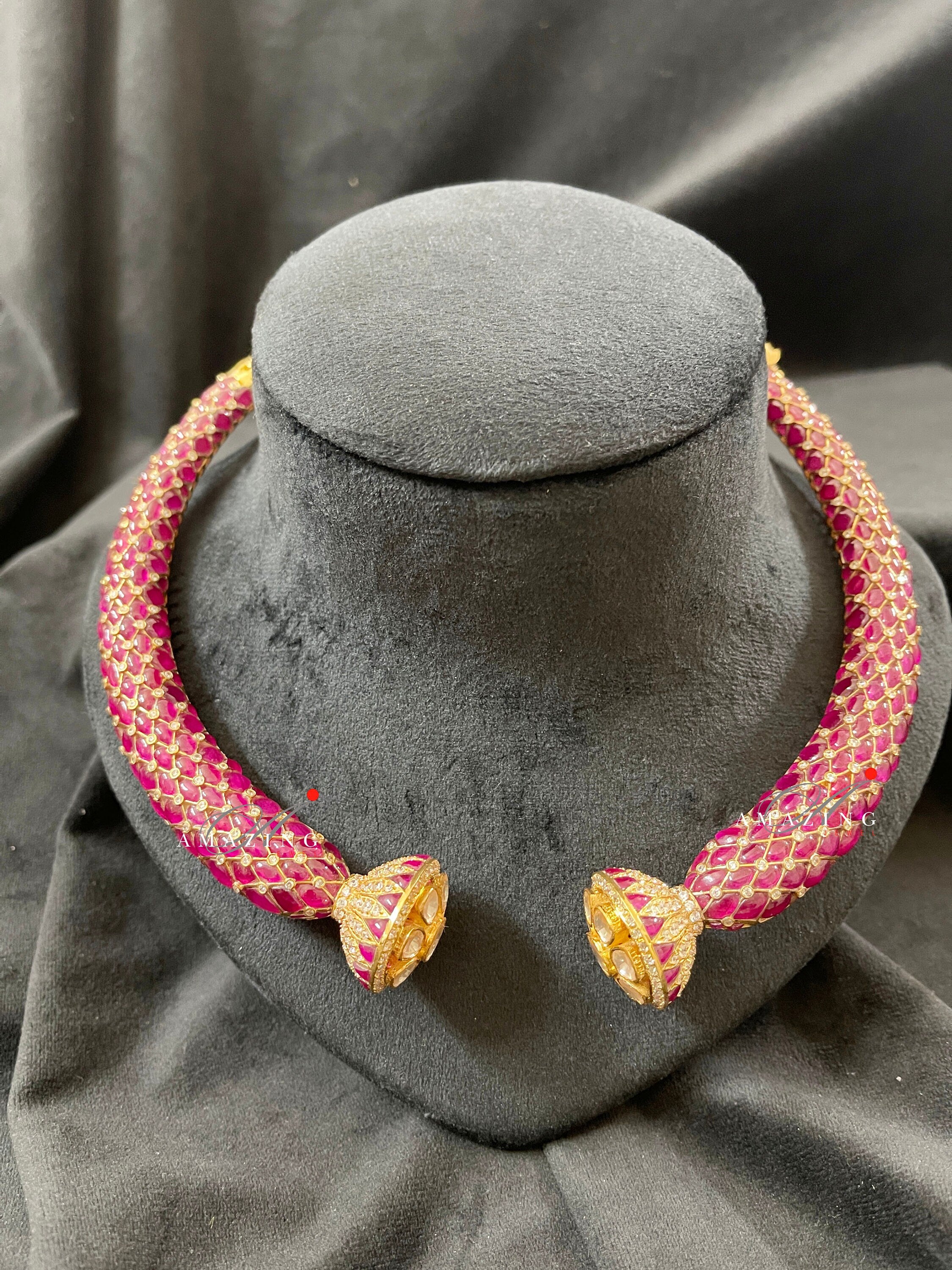 Silver Moissanite Polki Ruby Hasli set,Red Chip Stones Jewelery Indian Traditional Wedding Jewelery Set Bridal Necklace Hasli Necklace