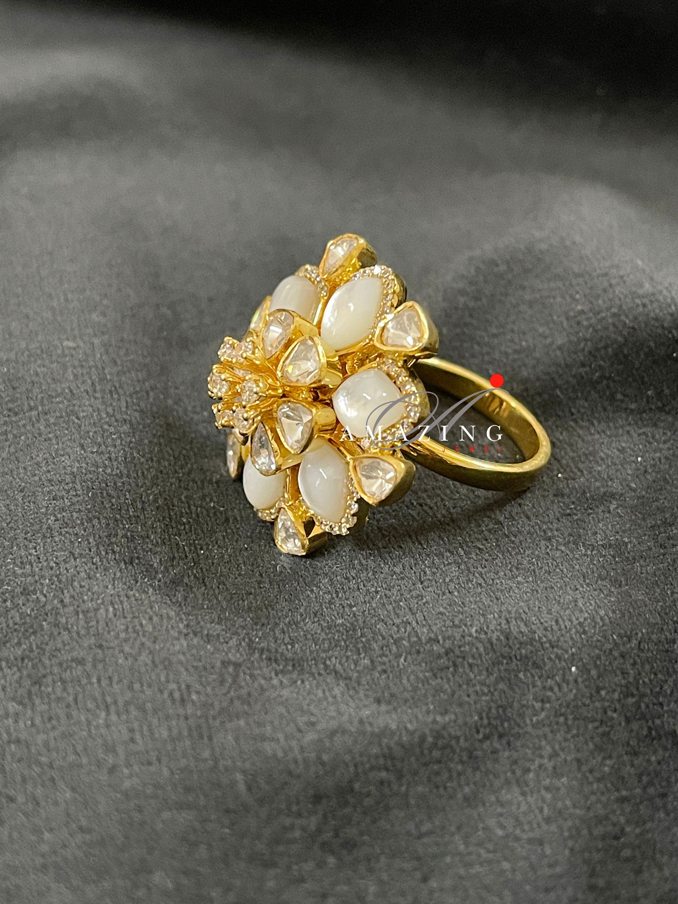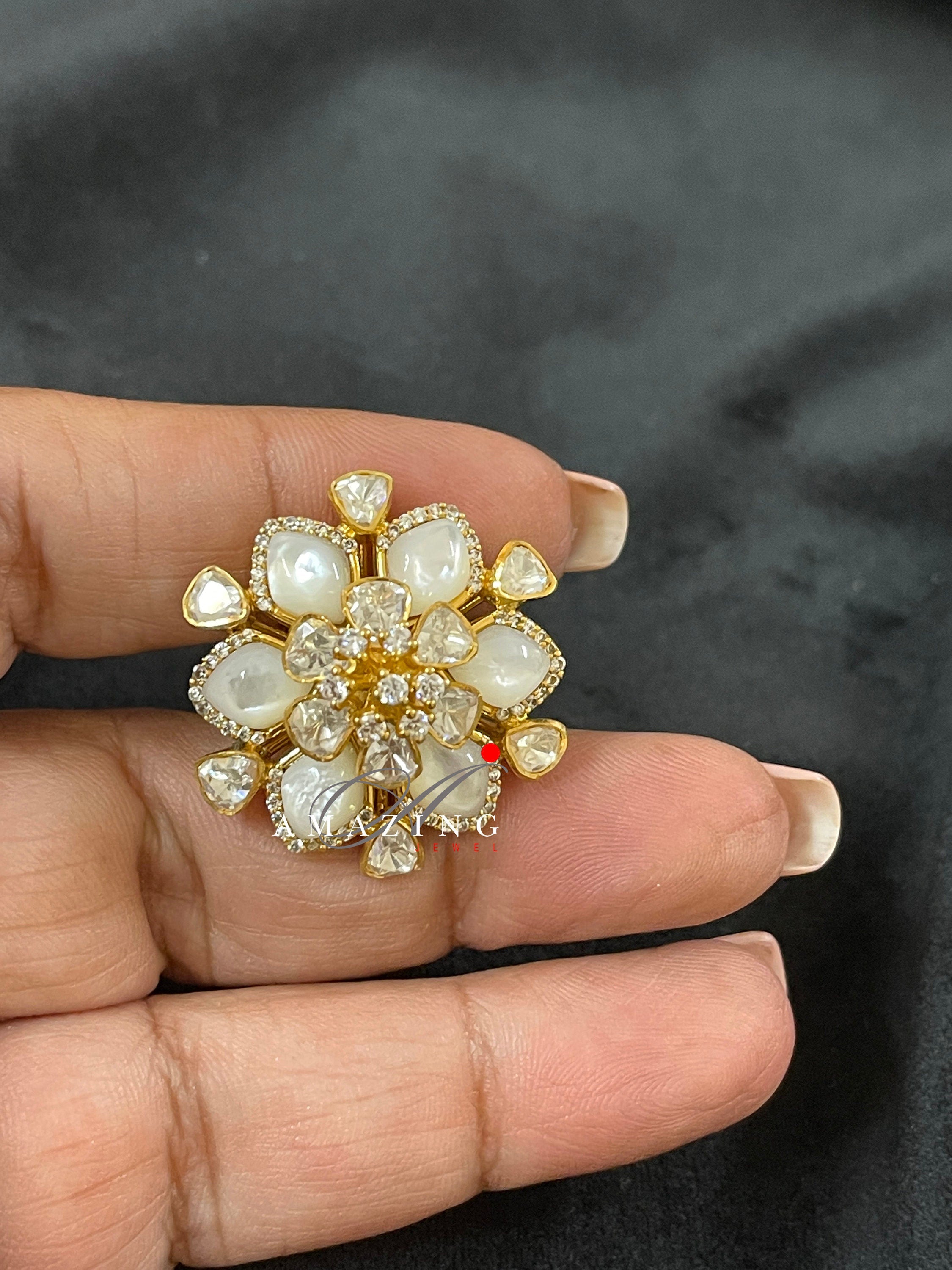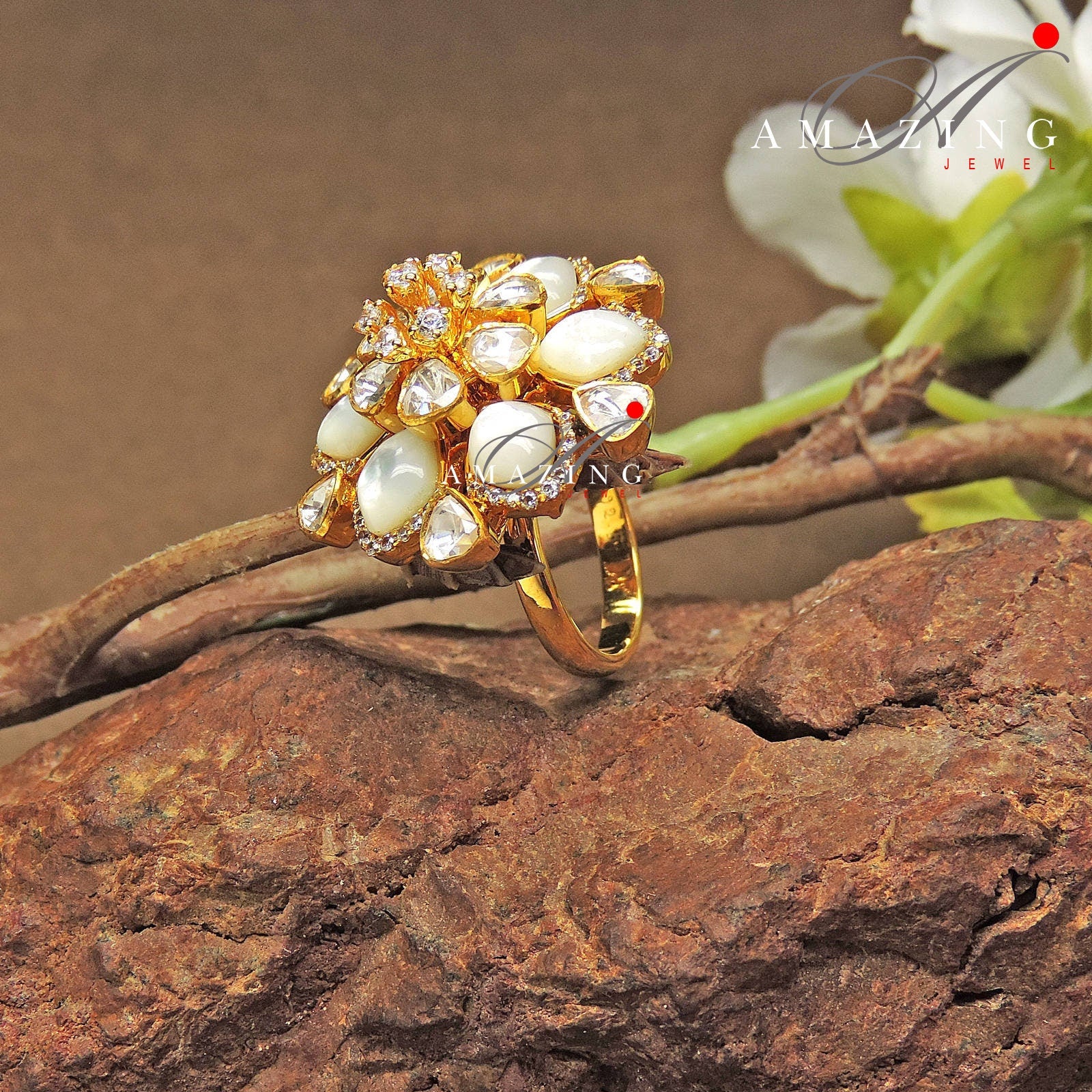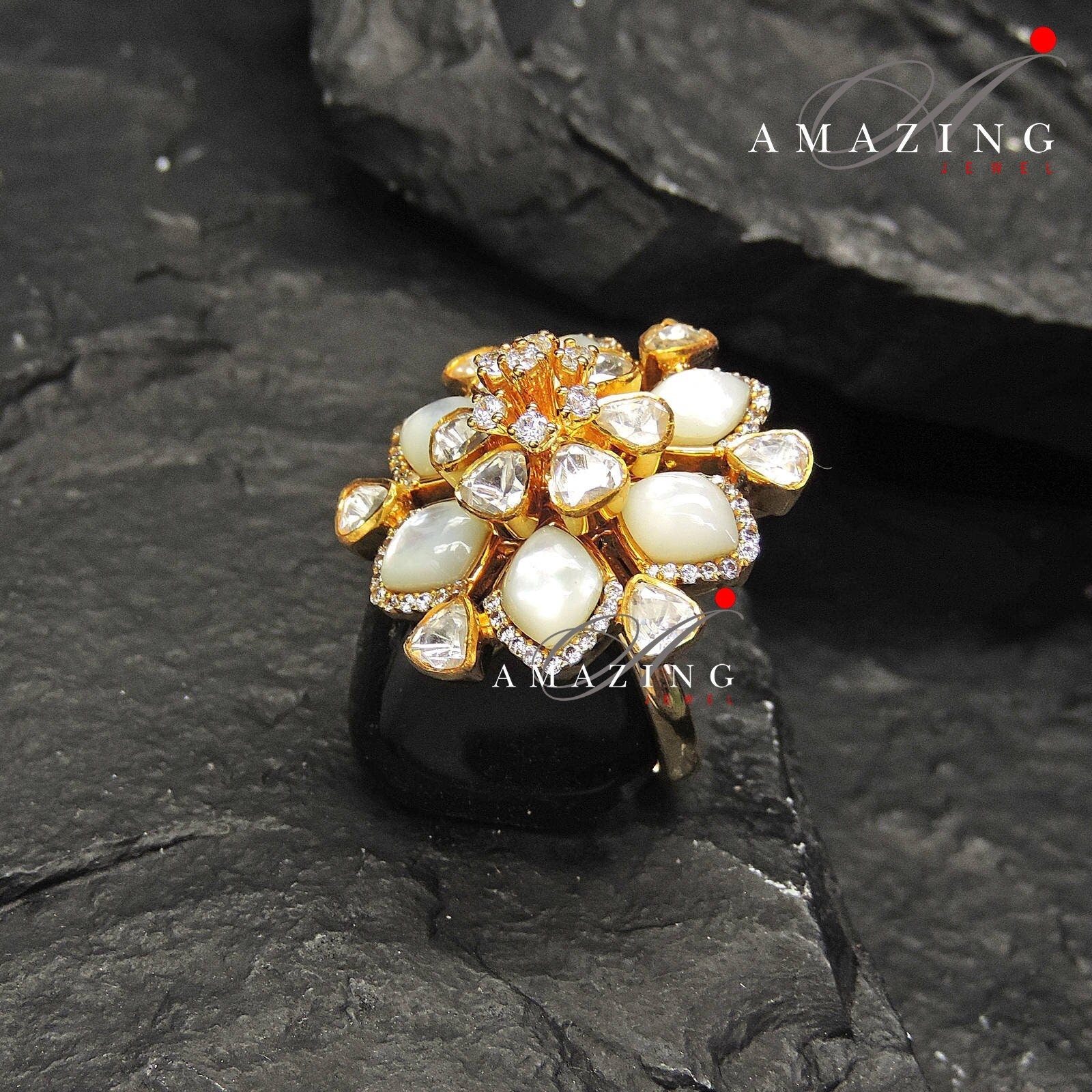 Silver Moissanite Polki Ring Indian Traditional Ring Polki Ring Moissanite Mother of Pearl Ring Polki Statement Ring Silver Cocktail Ring