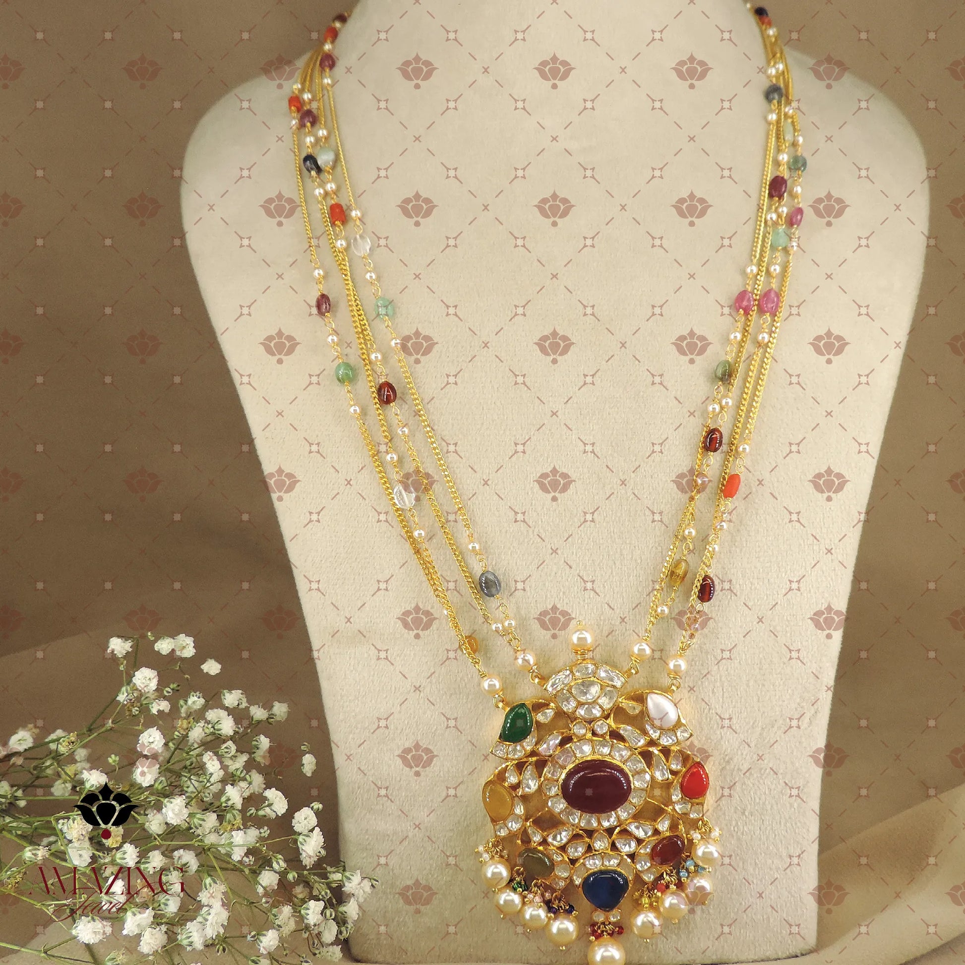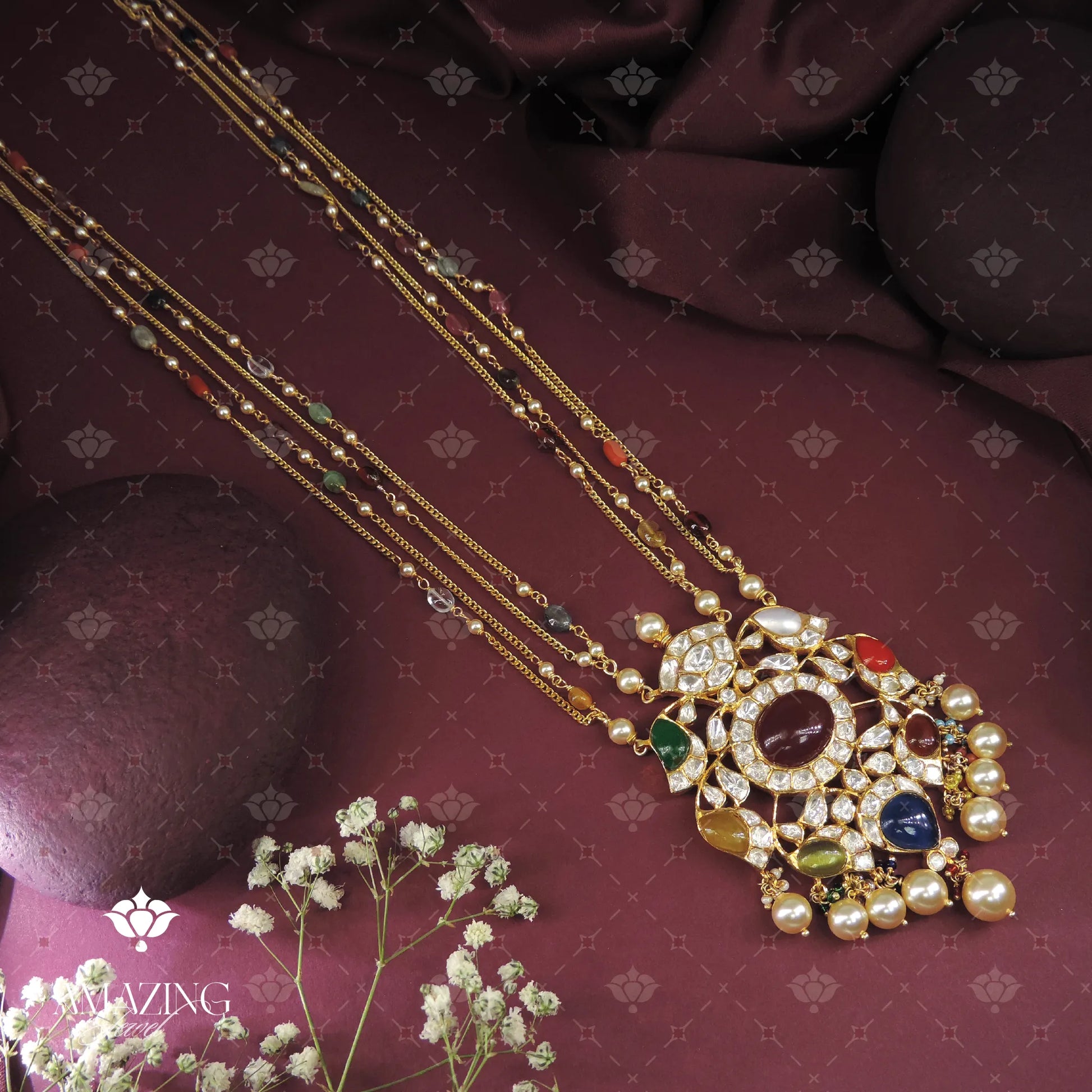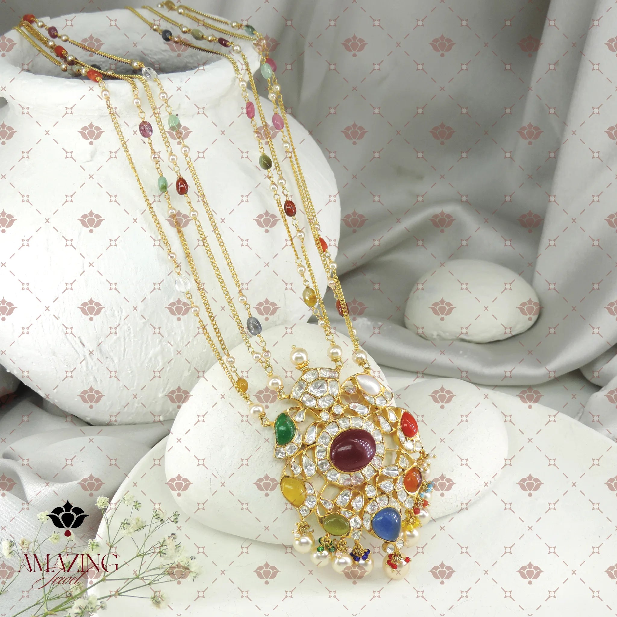 Stunning Silver Navratan polki Pendant. Designed with multiple layered gold-toned chains accented by vibrant Navratan beads, it features a grand pendant studded with rich multi-coloured gem stones, shimmering Polki clusters, and a fringe of luminous pearls for a true royal finish.