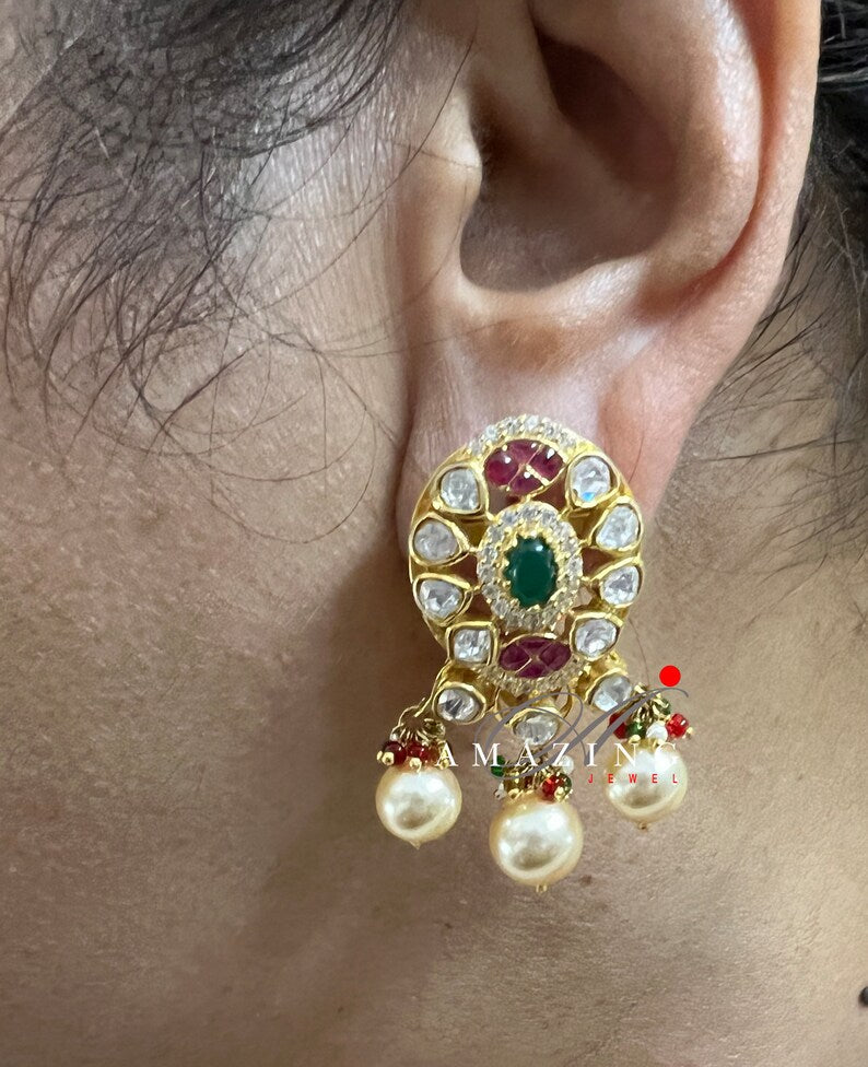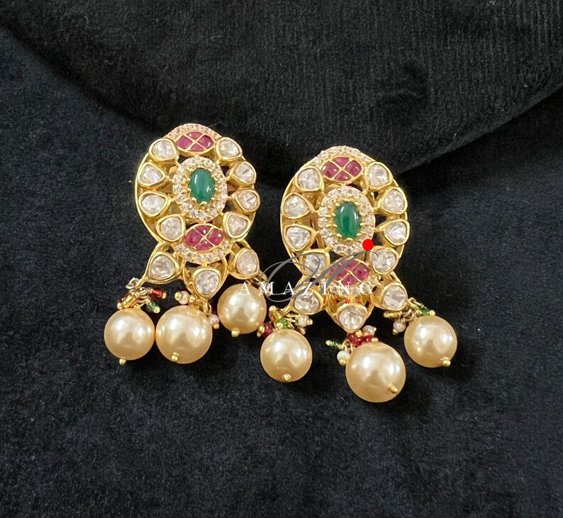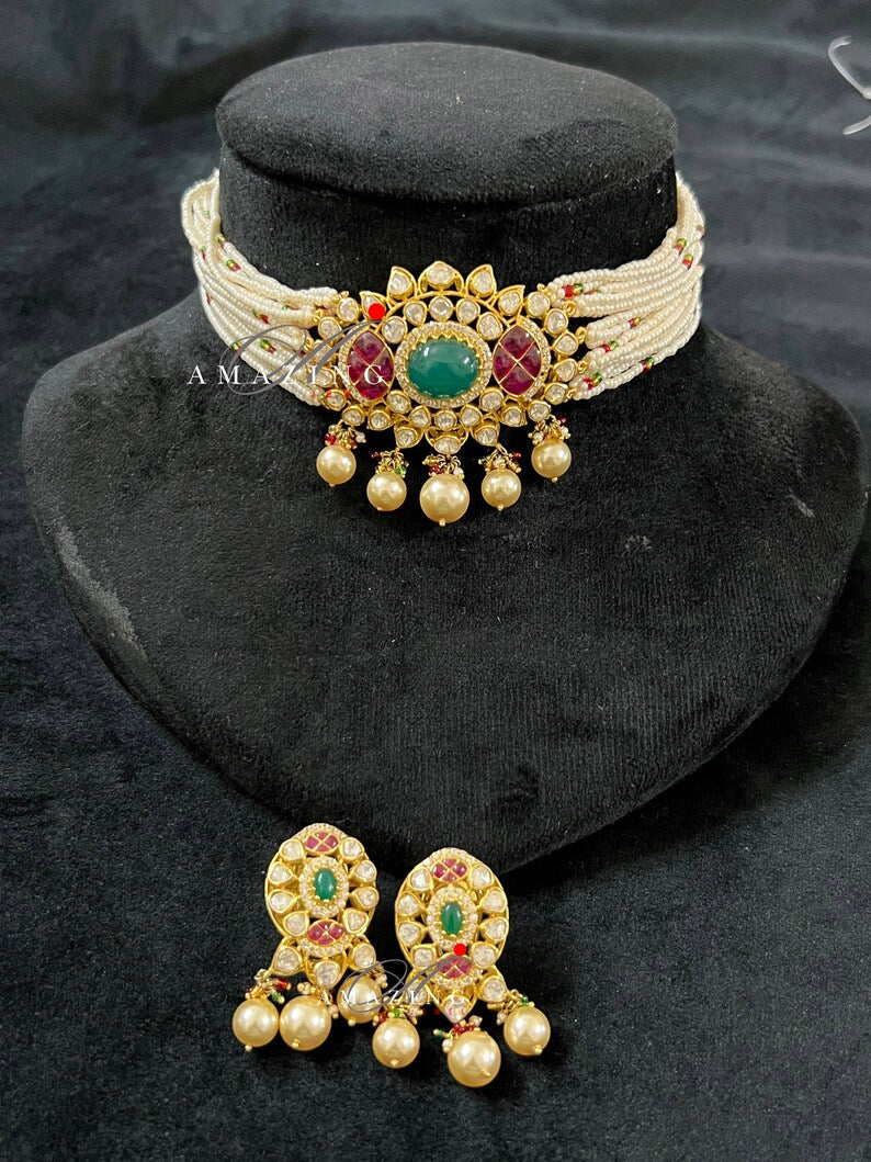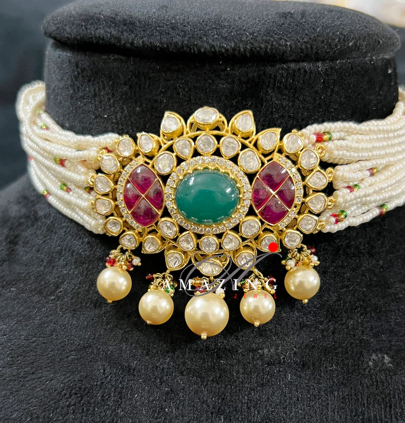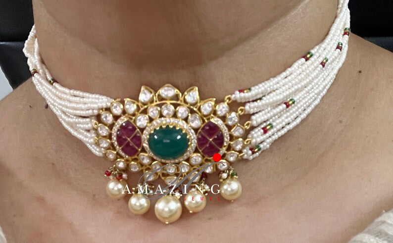 Silver Moissanite Polki Choker, Polki Necklace set, Traditional Wedding Jewelery Set, Polki set, Choker Set, Kundan Polki Choker Set, Pearls
