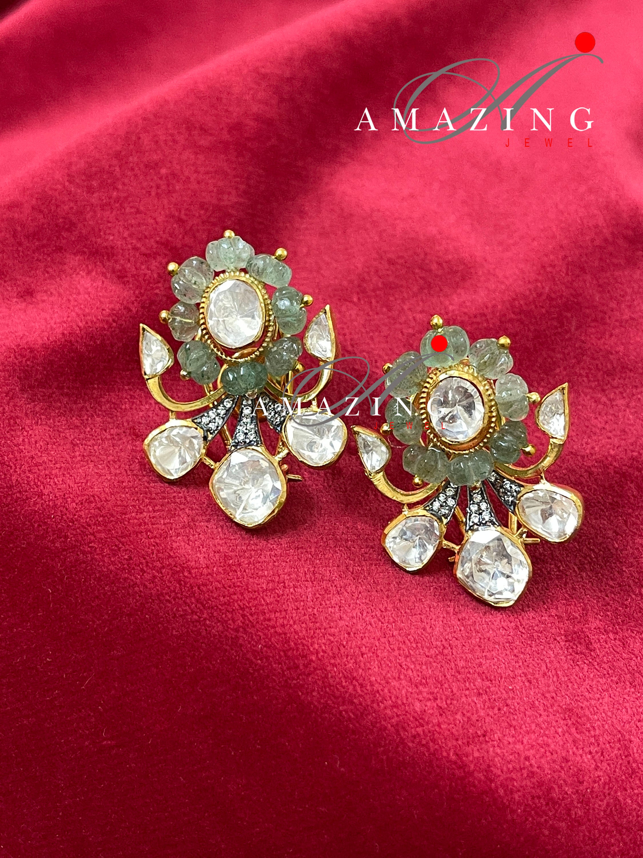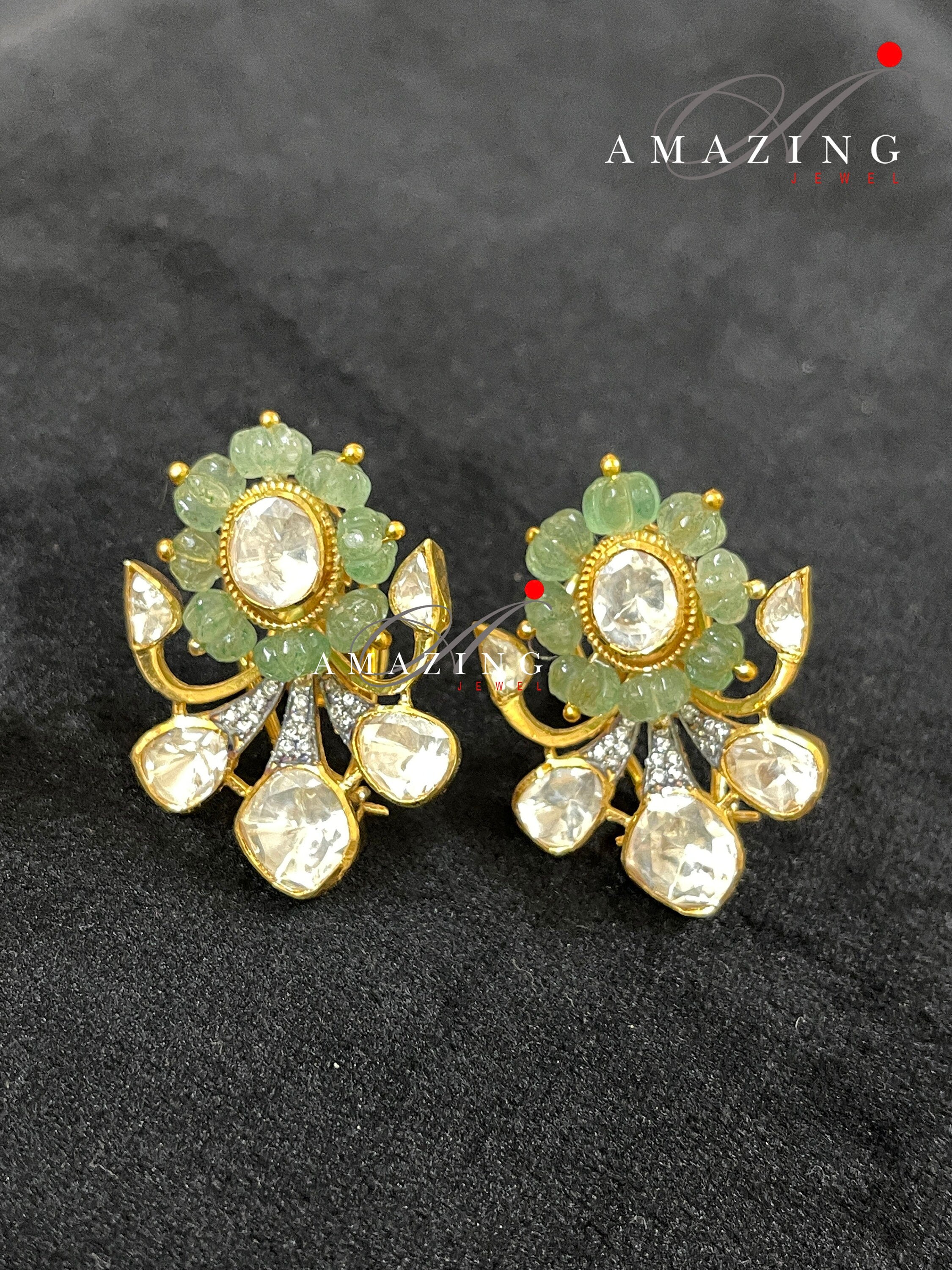 Silver Moissanite Polki Hydro Emerald Melon Earring,Indian Wedding Jewelery, Polki Stud,Statement Earring,Bridal Jewelery, Travel Jewelery