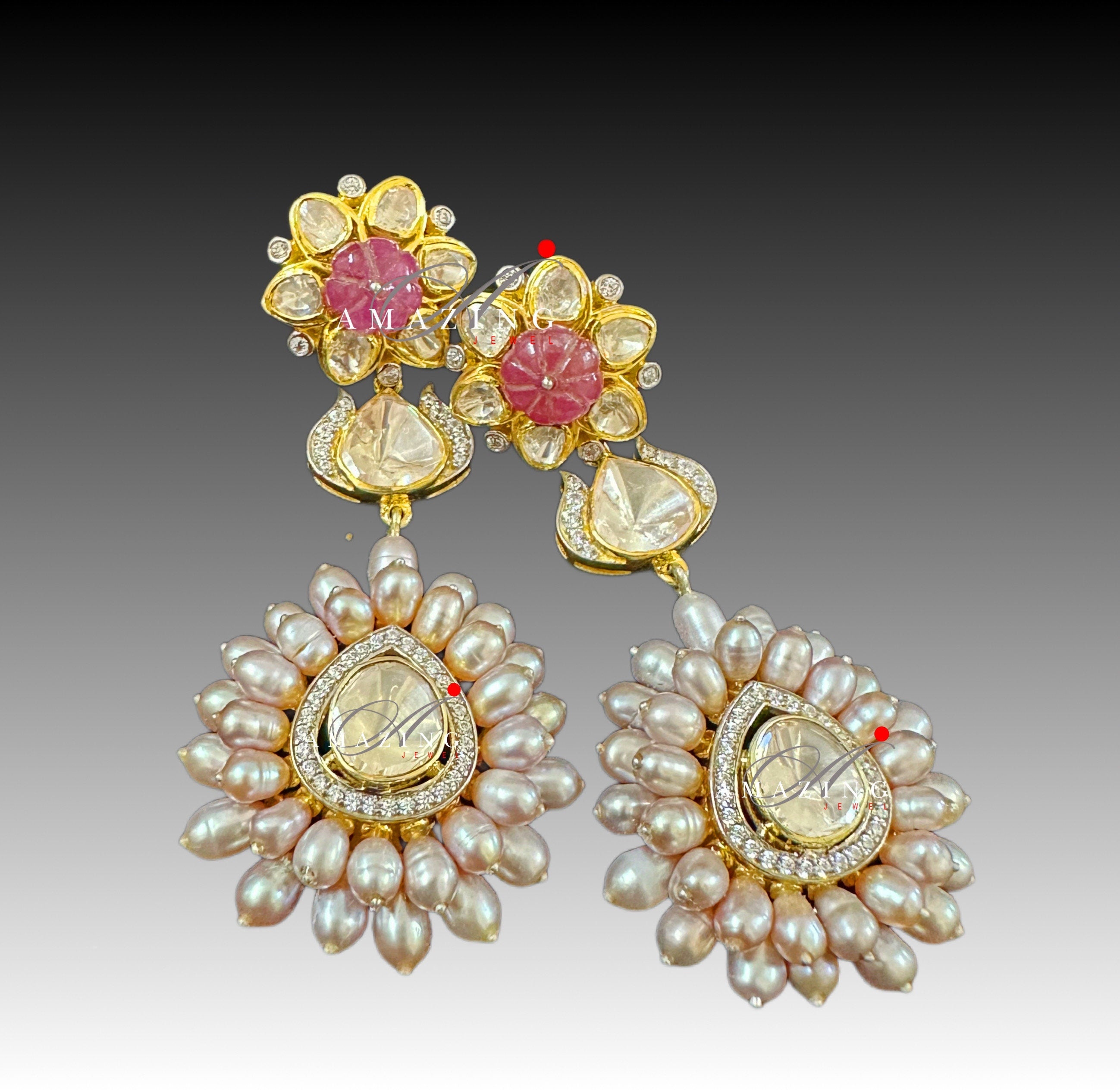 Silver Moissanite Polki Necklace Set with Pearls, Polki Jewellery, Wedding Jewellery, Polki set, Necklace, Earring, Statement Jewellery, Set
